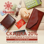 Скидка 20% на кошельки и портмоне по купону в чеке.