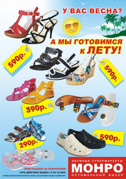 У Вас весна? а мы уже готовимся к лету! В обувных супермаркетах МОНРО с 6 по 16 мая женская летняя обувь 390 руб, мужская 590 руб, детская — 290 руб. Спешим за покупками! Кол-во обуви ограничено.