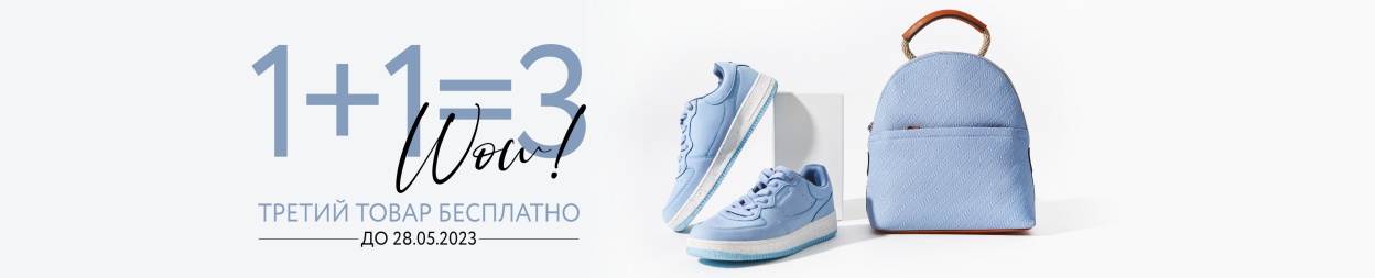 Условия акции: при покупке двух товаров из ассортимента обуви и/или сумок, третий, наименьший по стоимости товар предоставляется со скидкой 100%. Скидка, равная 100% стоимости третьего товара, расписывается в чеке путём пропорционального уменьшения стоимости каждого приобретаемого товара. Скидка по акции не суммируется со скидкой по дисконтной карте. На товары, приобретенные по акции, может быть предоставлена рассрочка. Подробности у консультантов.