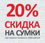 С 7 сентября по 31 октября 2016 вы можете получить скидку 20% на весь ассортимент сумок при покупке товаров на 1000 рублей (кроме сумок).