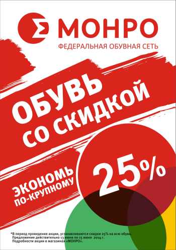 Федеральной обувной сети МОНРО уже более 19 лет. Отличительные черты бренда «МОНРО»: демократичные цены, качество и хороший выбор. В более чем в 200 магазинах, представленных в 78 городах России, работает около 3500 сотрудников.