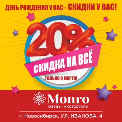 У магазина МОНРО по адресу ул. Иванова, 4 юбилей! Вот уже 15 лет любители стильной и качественной обуви радуют себя приятными приобретениями по выгодной цене именно здесь. В честь знаменательного события на весь ассортимент магазина 08.03.2020 г. действует скидка 20%. Праздник у нас - подарки вам! Успейте купить все, что нравится с приятной экономией. Поздравьте любимый магазин МОНРО выгодными покупками.